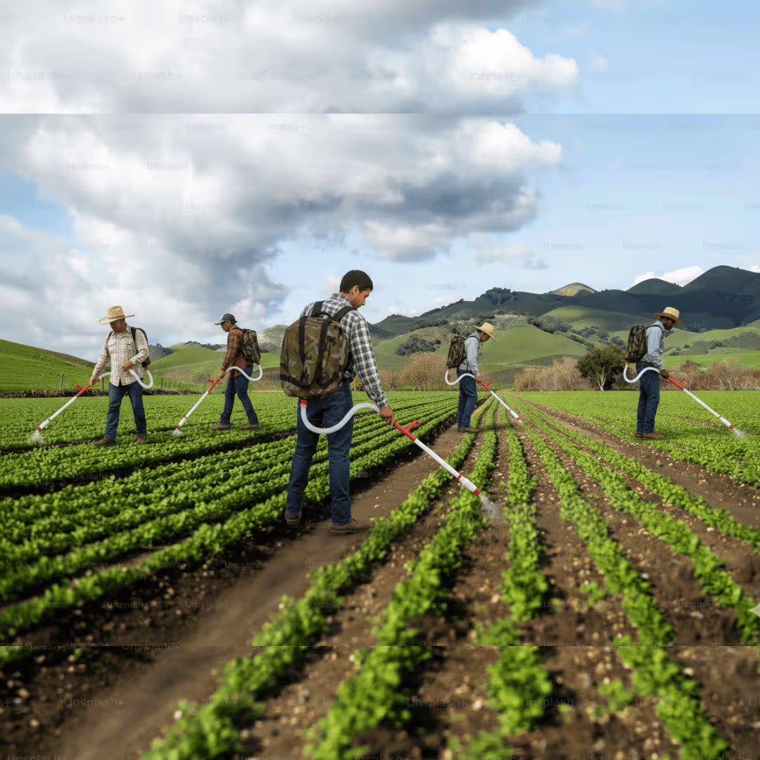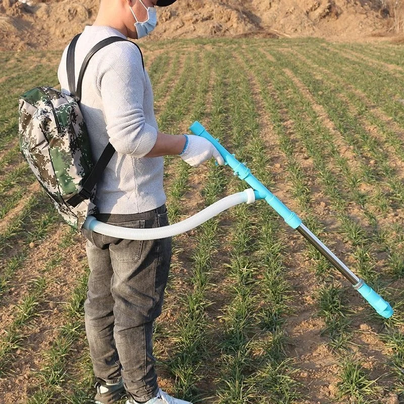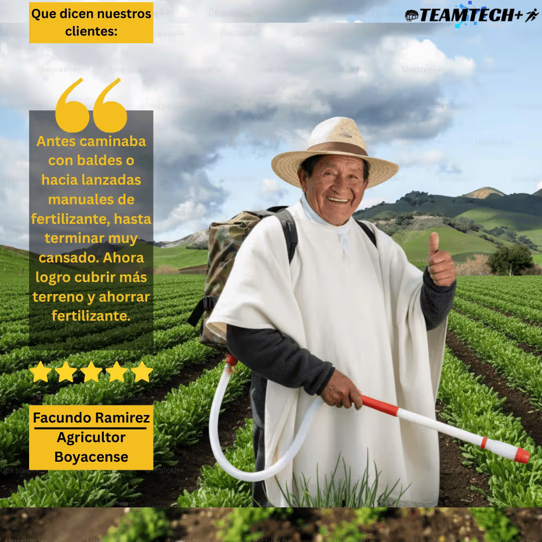 Se gasta medio día regando a mano y termina adolorido. Pierde abono porque el costal no reparte parejo.